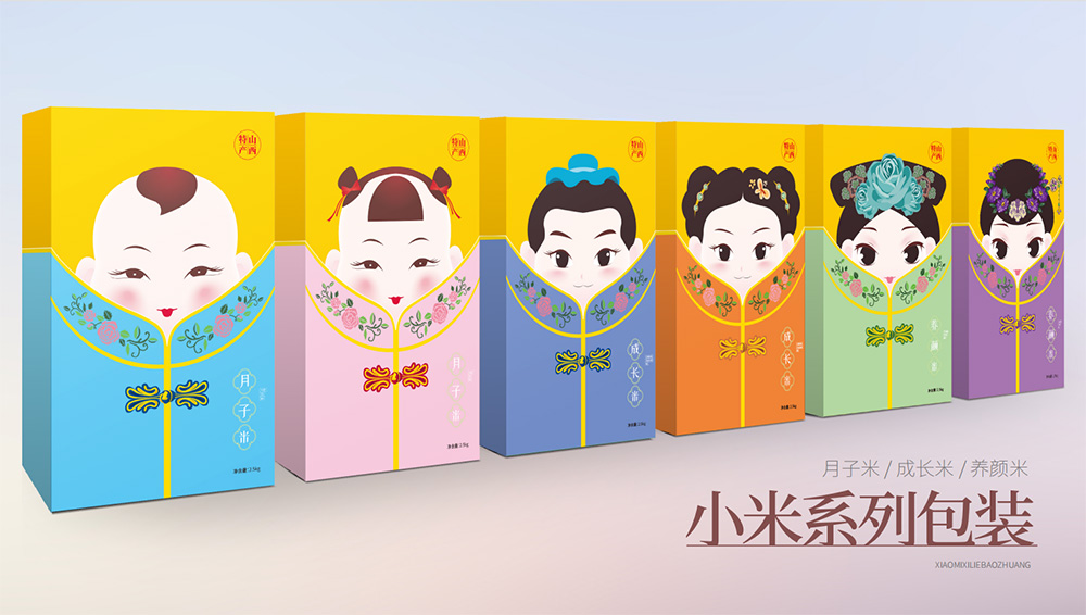 區(qū)別于傳統(tǒng)小米包裝,根據(jù)小米的不同搭配將小米分為月子米,成長米,養(yǎng)顏米3類,視覺上分別以成對的嬰兒、小孩、年輕女性/媽媽為主要形象元素,采用現(xiàn)代插畫的形式創(chuàng)造三組萌趣生動的形象,畫面生動富有張力,配色清醒典雅,增強產(chǎn)品親和力。包裝盒外加設計有古典服飾圖形的封套,整體形式新穎富有層次感,拆掉封套將呈現(xiàn)另一幅畫面,開盒有趣味,讓整體形成記憶點。